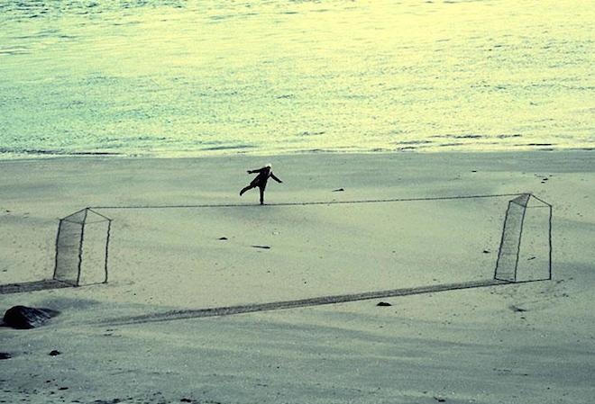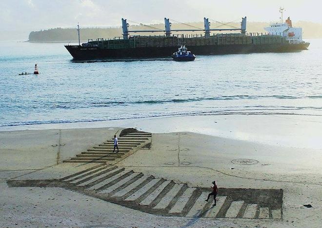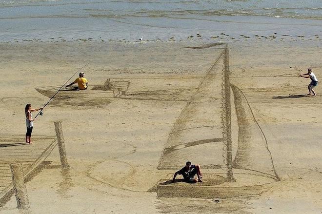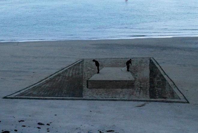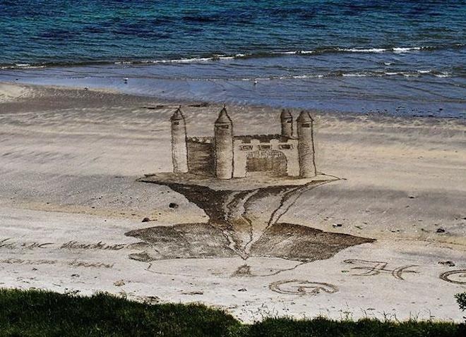 | Jamie chia sẻ: "Tôi thường thấy mọi người có những hoạt động trên bãi biển, nhưng nó chỉ rất đơn giản, giống như một mô hình bằng phẳng. Vì vậy, tôi nghĩ mình cần làm nó tuyệt hơn bằng 3D. Tôi rất thích việc thuỷ triều lên hàng ngày làm mất các tác phẩm của mình. Bởi như thế chúng trở nên đặc biệt, vô thường hơn". |