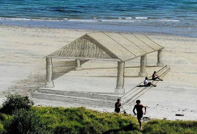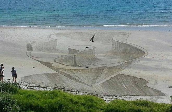 Jamie Harkins khiến nhiều người ngỡ ngàng với những bức vẽ 3D khổng lồ trên bãi biển. Mỗi tác phẩm của cô đều rất ấn tượng và cuốn hút.