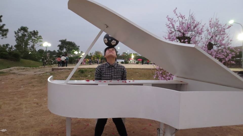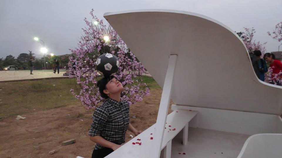 | Khoảnh khắc vừa chơi piano vừa tâng bóng thú vị của Huyền. |