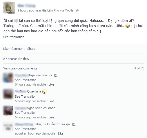Bố cô gái tỏ ra khá tức giận về việc này, không chỉ trả lại quà, còn trả thêm cho anh chàng người yêu cũ của con gái mình 2 triệu đồng, mà bác gọi đó là tiền hoa quả. Mẹ của cô gái cũng cẩn thận kê khai ra từng thứ để trả lại, gồm một chiếc khăn, bông tai, nhẫn, một chiếc điện thoại và 2 triệu đồng.