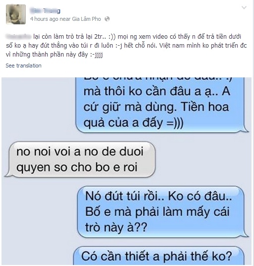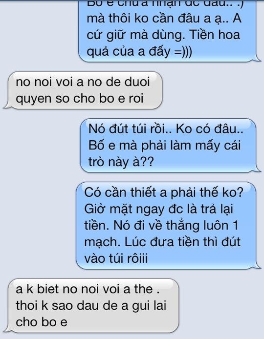 | Trong đoạn tin nhắn này, người yêu cũ của cô nhắn tin sau khi đòi xong quà với nội dung, người đến đòi quà hộ nói là 2 triệu kia đã để lại chứ không cầm về. Tuy nhiên cô gái vẫn khẳng định rằng anh kia đã cầm 2 triệu đồng mà bố cô đưa. |