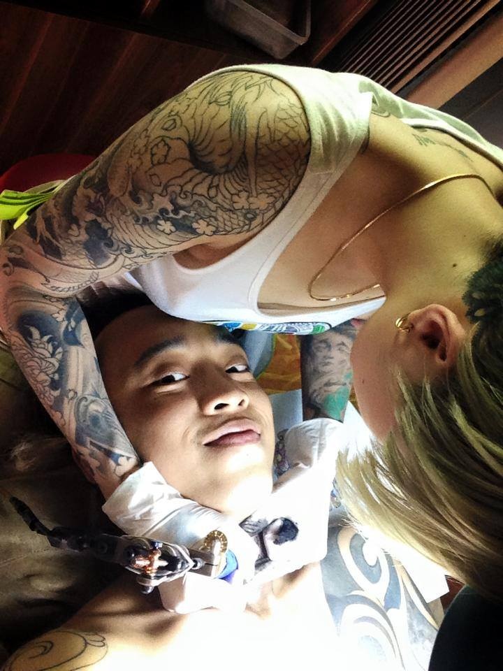 | Ngọc Anh đang thực hiện hình xăm cho chồng. |
