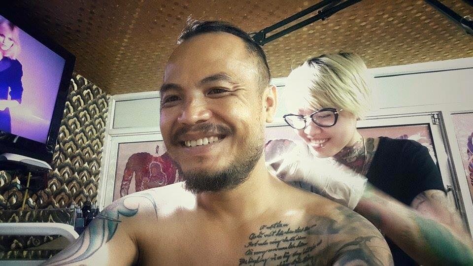 "Trên người anh ấy toàn hình xăm mình làm. Mình xăm rồi sửa đè bằng một hình đẹp hơn, nên giờ rất thạo kỹ thuật đè hình", Ngọc Anh chia sẻ.