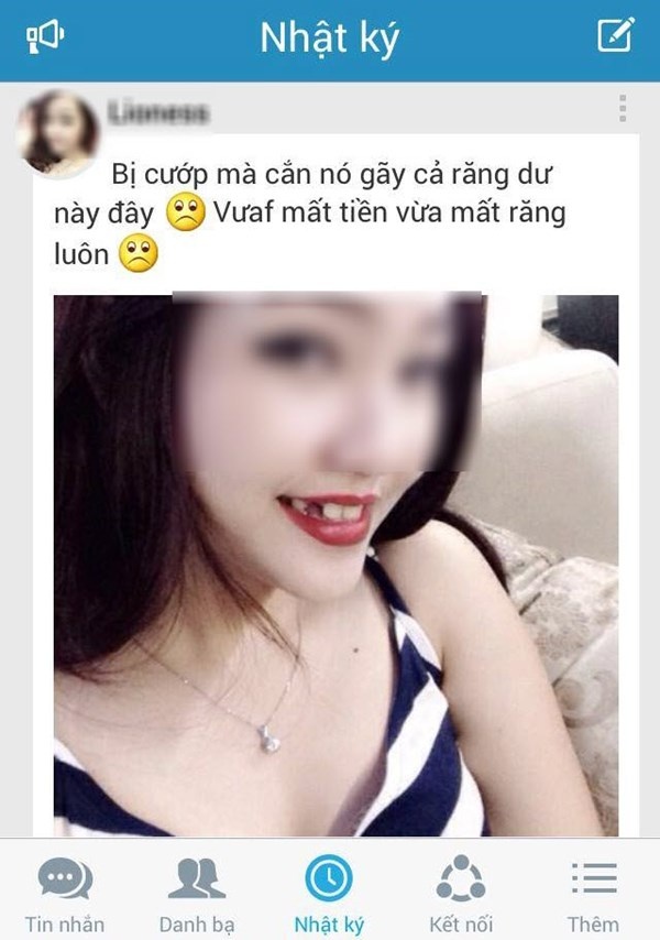 Ngày 20/5, trên các diễn đàn dành cho giới trẻ vừa cho đăng tải hình ảnh cô gái có nickname Lioness bị gãy răng vì vật lộn với cướp thu hút sự chú ý của cộng đồng mạng. Theo thông tin của người cung cấp, bức ảnh được chính cô gái chụp lại và đăng tải lên Zalo kèm theo lời chú thích: "Bị cướp mà cắn nó gãy cả răng như này đây. Vừa mất tiền vừa mất răng luôn".