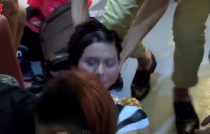 Cô gái đến từ Kiên Giang được đưa vào phòng đợi để sơ cứu. Cô nằm bất động trên sàn trước sự lo lắng của các bạn đồng hành.