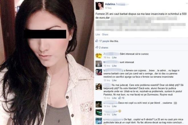 Theo Daily Mail, Adelina Albu (25 tuổi, đến từ miền Tây Romania) là cô gái gây chú ý trên mạng những ngày gần đây. Adelina thông báo, cô sẽ chi 500 Euro (khoảng 12 triệu đồng) cho người đàn ông nào đủ khả năng và đồng ý giúp cô mang bầu.