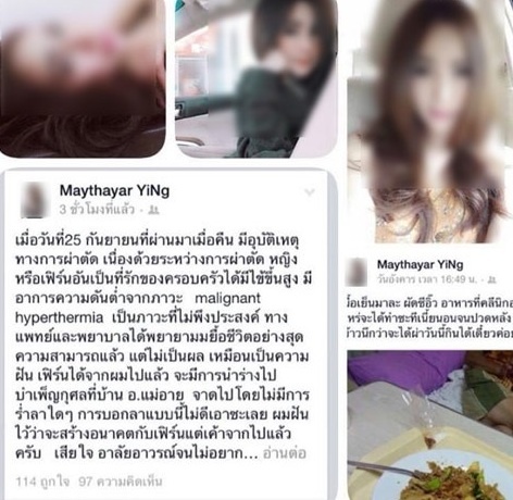 Theo trang News.sanook của Thái, thông tin cô gái có tên Mathayar Ying tử vong trong quá trình phẫu thuật gọt cằm đã gây chấn động mạng vào tối 29/9. Tin tức nhanh chóng được truyền đi trên Facebook, Twitter như một lời cảnh báo đáng sợ cho những ai đang có ý định nhờ dao kéo cải thiện vẻ đẹp một cách quá đà.