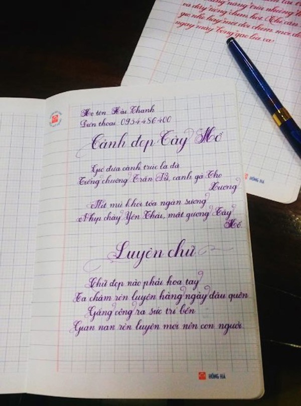 Cùng lúc đó, bố Hải Thanh là một người có chữ đẹp, hay viết bằng khen cho đơn vị, cô được bố hướng dẫn tỉ mỉ cách viết. “Lúc đấy mình đã tin việc viết đẹp rất dễ, chỉ cần học đúng phương pháp”, Thanh nói.
