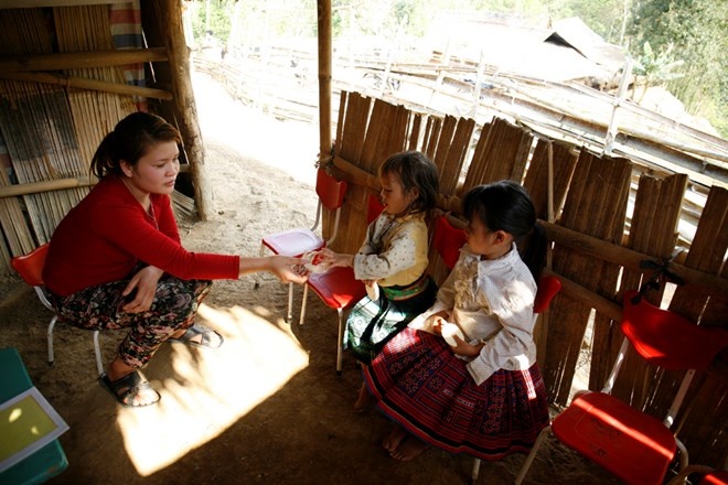 | Minh cho biết: "Các cháu ở đây thường theo mẹ lên nương hoặc bố mẹ không muốn con đi học". |