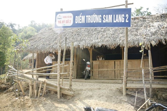 Ngồi sau xe, anh Nguyễn Trọng Hải, Giám đốc bưu điện Mường Nhé, bưu tá kỳ cựu, tôi có điều kiện đến điểm trường Sam Lang 2 đầu tiên. Điểm trường là hai túp lều tạm bợ đứng cạnh nhau, hàng rào đơn giản.