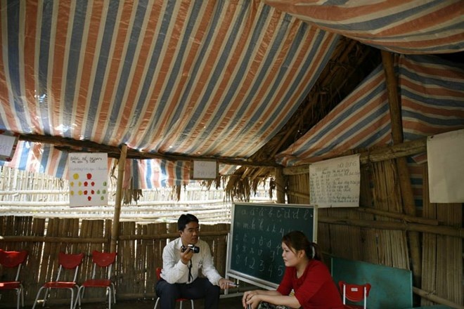 Túp lều bên phải được ngăn đôi, một bên lớp học ghép của các em, một bên phòng của thầy giáo, còn bên trái là điểm trường mầm non cũng chia làm đôi. Một bên lớp học cho trẻ mầm non không tường, vách mà được làm bằng cây nứa đập dập xếp vào nhau, cho đỡ trống. Bức tường nứa đó cũng chỉ cao quá thắt lưng người lớn. Mái nhà được lợp bằng lá cọ nhưng có lẽ vẫn dột nên được căng bạt phía trên.
