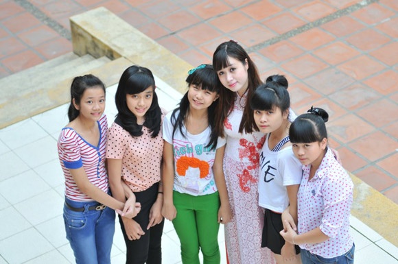 | Cô giáo xinh đẹp Nguyễn Lan Phương (áo dài) luôn được học trò yêu mến. |
