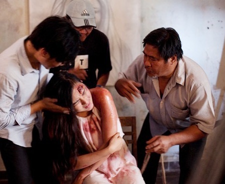 | Trương Quý Nhi lúc bị tai nạn. Quý Nhi cho biết cô bị bỏng không quá nặng, những vết trên mặt là hóa trang. Ảnh Đất Việt. |