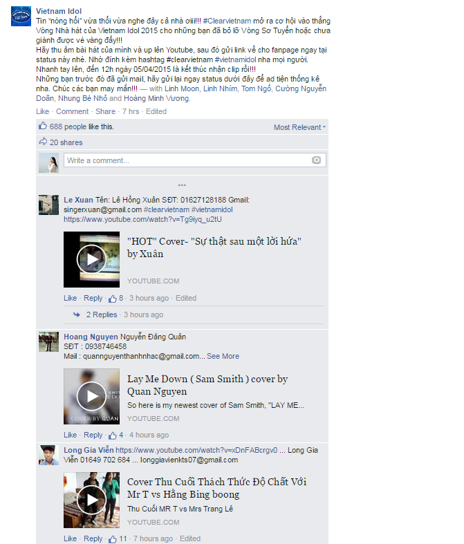 Thông tin về cơ hội cuối cùng để lấy tấm vé vàng vào vòng trong Vietnam Idol 2015 khiến các bạn trẻ rất hào hứng. Những ai muốn dự thi nhanh chóng gửi link bài hát của mình về chương trình, một số bạn không tham gia cũng tích cực chia sẻ thông tin. Số lượng comment trên fanpage CLEAR và Vietnam Idol tăng nhanh chóng.