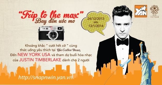 Cuộc thi “Trip to the max” do YAN phối hợp cùng The Coffee Bean & Tea Leaf tổ chức từ ngày 24/12/2013 - 13/1/2014, trong phạm vi toàn quốc với thể lệ cực kỳ đơn giản. Bạn chỉ cần chụp lại những tấm hình cười hết cỡ của mình và bạn bè, cùng với sản phẩm của Coffee Bean yêu thích nhất của mình trong Coffee Bean Store. Sau đó, bạn up ảnh của mình lên trang Snap&Win tại http://snapnwin.yan.vn. Cuối cùng bạn chỉ cần kêu gọi lực lượng like hùng mạnh của mình để có cơ hội nhận được 3 phần giải tuần và 1 giải đặc biệt.