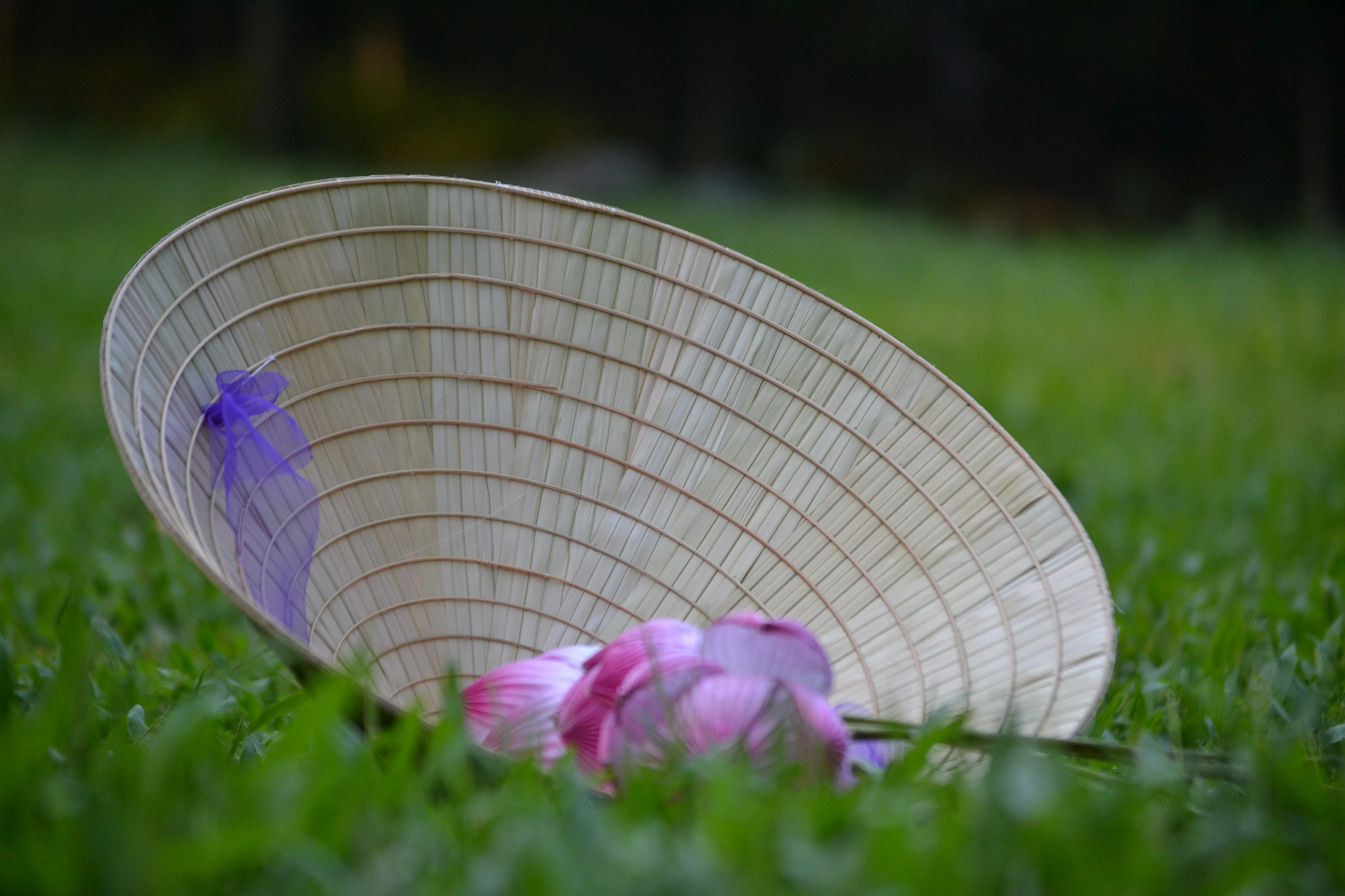 | Một chút Huế vương lại nơi nón lá - sen tím và đình cổ. |