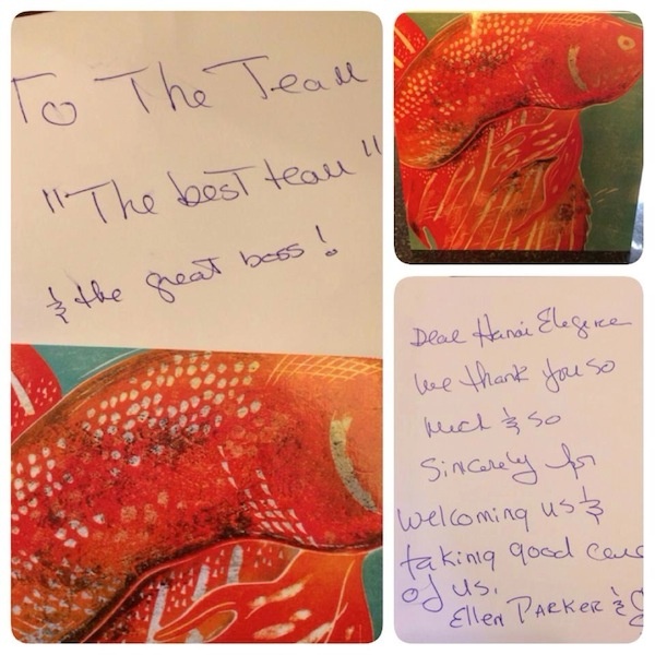 Huyền còn nhớ cảm giác vui sướng, tự hào khi được các vị khách nước ngoài quý mến, và hết lời khen ngợi tại khách sạn hay trên TripAdvisor (trang web nổi tiếng về du lịch). Cùng với đó là những món quà tặng độc đáo mà đến nay cô đã không thể đếm xuể. Nữ lễ tân chia sẻ: “Mình đã từng vô cùng xúc động khi nhận được chiếc khăn len do chính tay một khách người Úc đan gửi tặng kèm theo lời mời sang thăm nhà”.