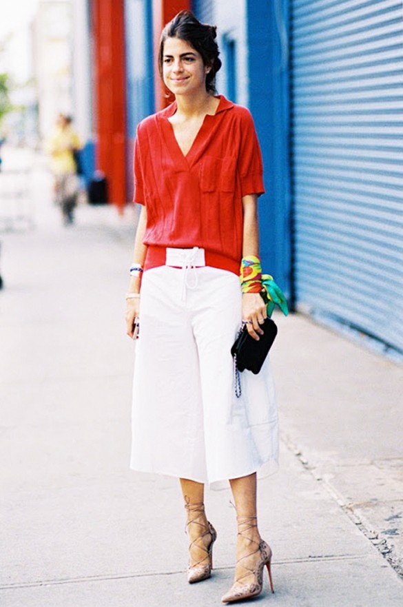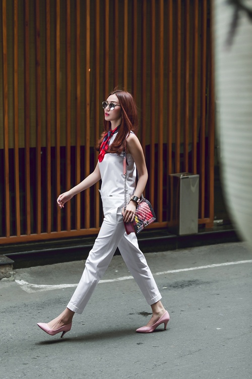 | Hoàng Thùy Linh khéo léo biến chiếc khăn thành áo yếm. Cô nhanh chóng có bộ trang phục cá tính và rất gợi cảm khi dạo phố. |