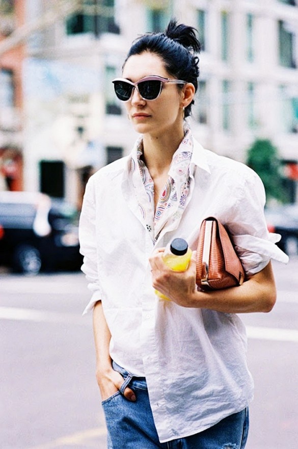| Hoa hậu Thu Thảo với lựa chọn khăn lụa nhỏ thắt kèm váy sơ mi để tăng vẻ thanh lịch. |