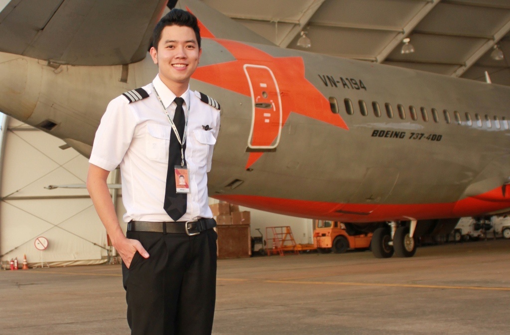 | Nguyễn Quang Đạt hiện đang làm phi công với vị trí cơ phó cho hãng hàng không Jetstar Pacific . Đạt có nét điển trai, nụ cười tươi tắn. |
