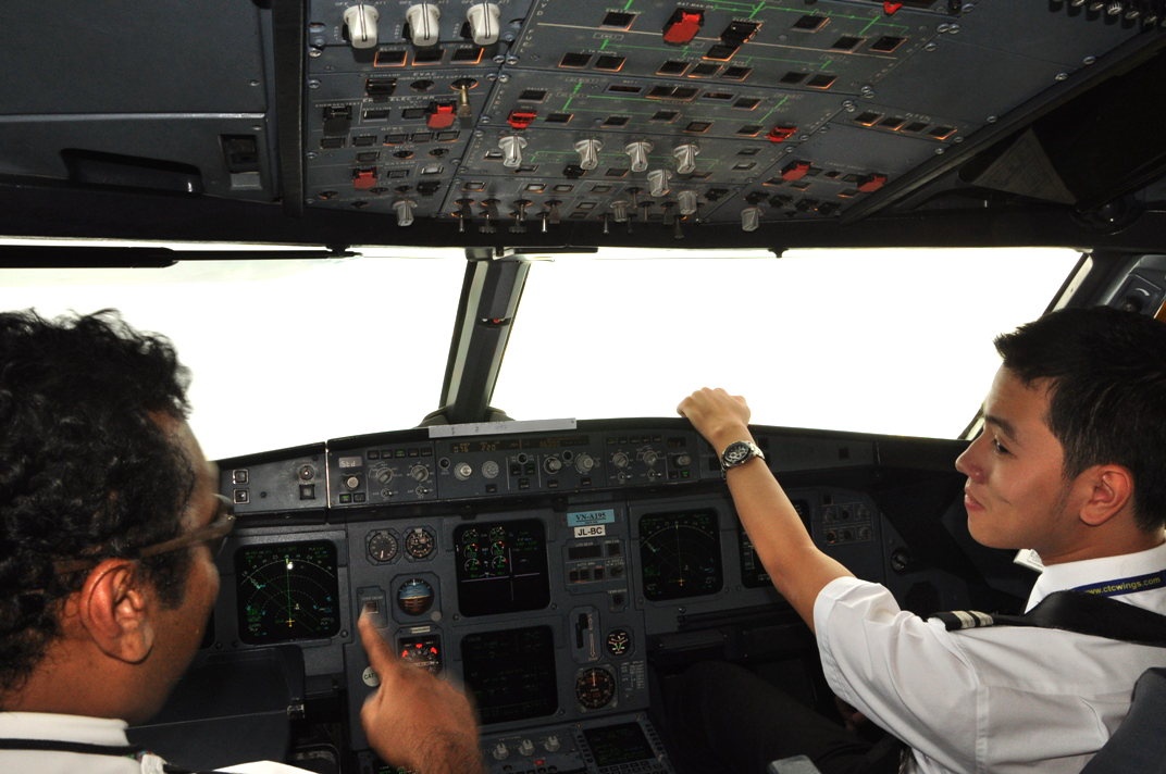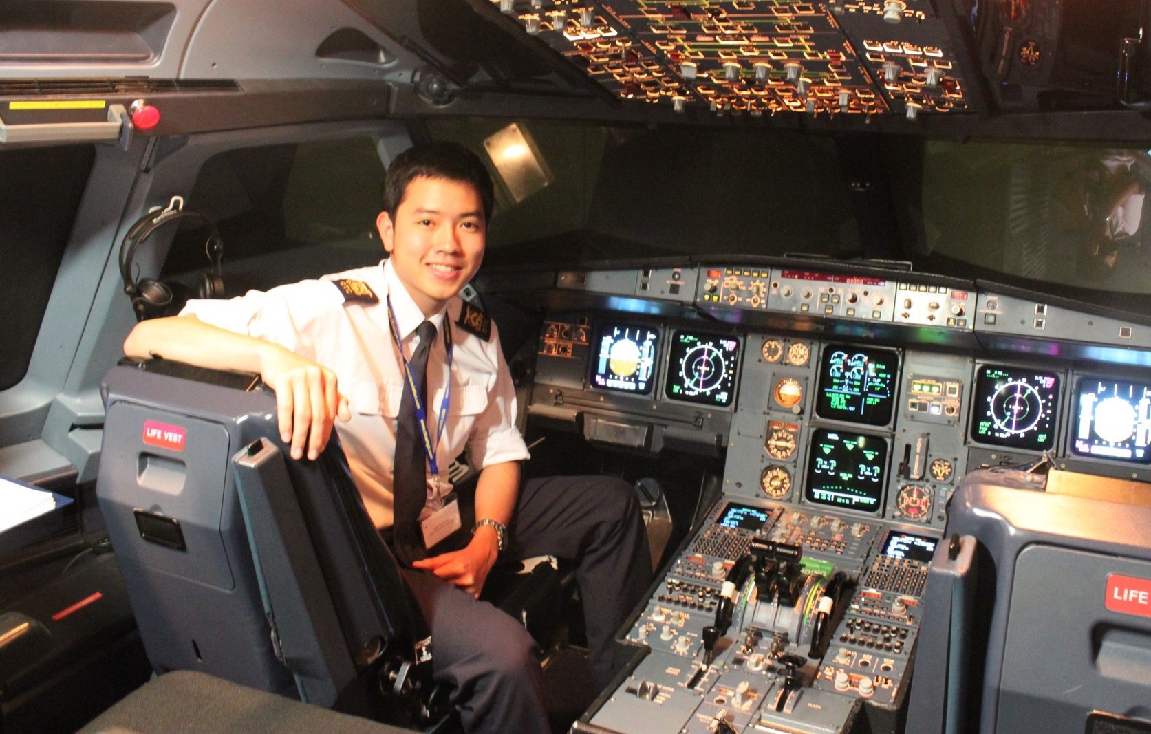 | Nguyễn Quang Đạt trong học lái máy bay Airbus 320 trong lần tập huấn ở Southampton. |