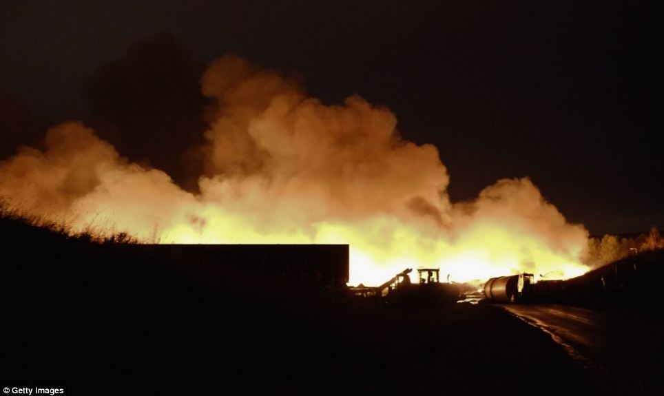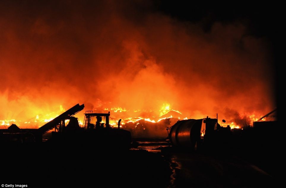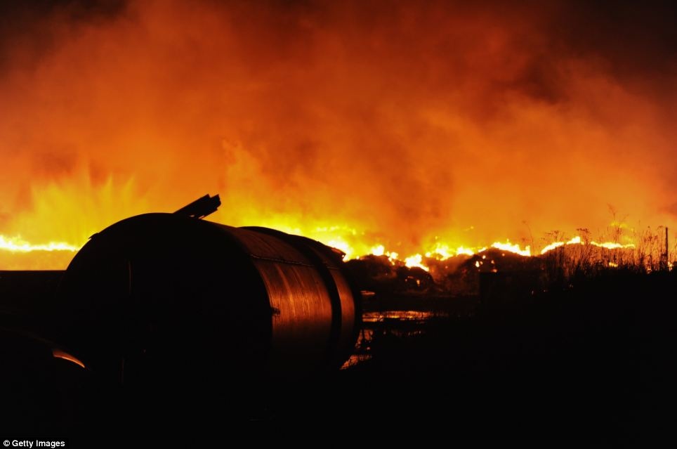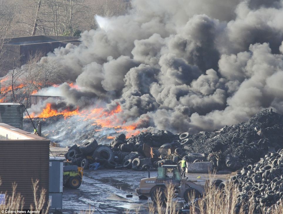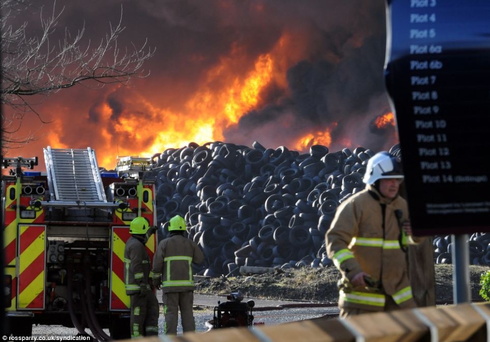 | Lửa đã thiêu khoảng 15.000 tấn lốp, săm và một số nguyên liệu cao su khác trong mấy ngày qua. Ảnh: Caters News |