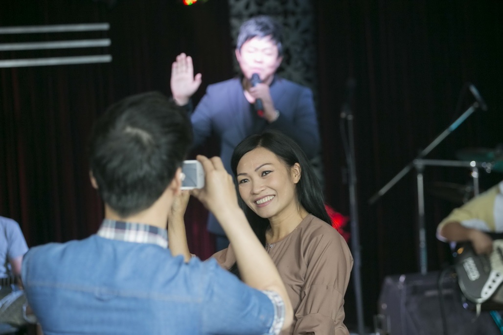 | Lúc quá lạnh, nữ ca sĩ còn mượn tạm áo vest của Quang Lê để mặc. |