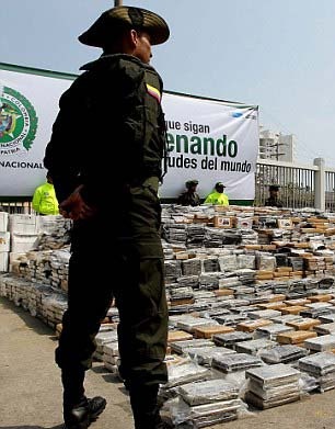| Tướng Rodolfo Palomino, cảnh sát trưởng Colombia, đang kiểm những gói ma túy ngày 10/4. Năm 2005, nhà chức trách Colombia từng bắt giữ 15 tấn ma túy dọc bờ biển Thái Bình Dương. Colombia là một trong những quốc gia sản xuất ma túy lớn nhất thế giới. Ảnh: AP. |
