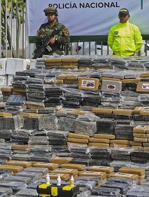 | Cảnh sát quốc gia Colombia công khai 7 tấn ma túy mà họ vừa tịch thu tại cảng Cartagena, Colombia ngày 10/4. Ảnh: EPA. |