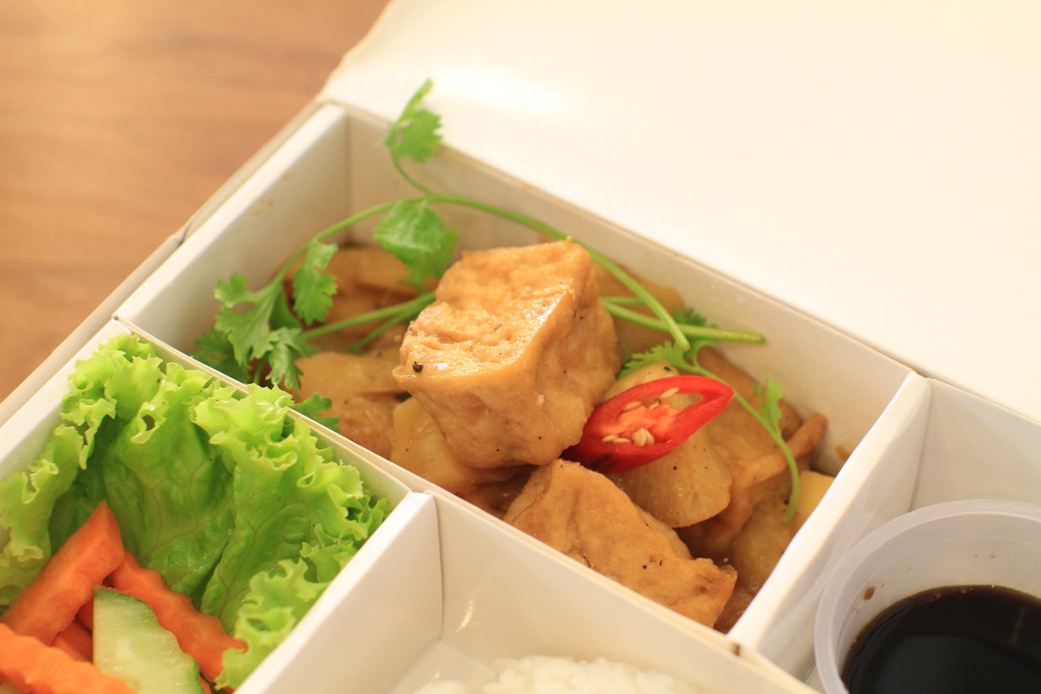 Với tiêu chí “bao no”, set cơm chay của quán có đủ các món chính, phụ, canh, cơm và nước uống. Tất cả được trình bày đẹp mắt trong hộp giấy, riêng canh và nước uống thì đóng chai/ly có nắp cẩn thẩn.