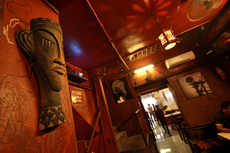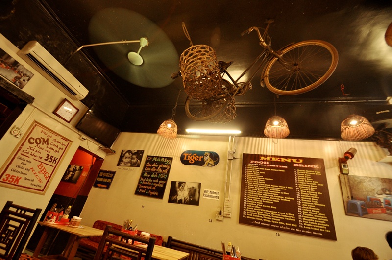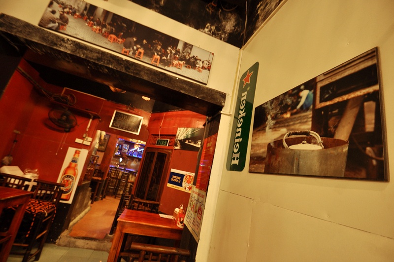 Quán được điểm thú vị trước hết bởi không gian khá phong cách. Tường nhà sơn màu trầm tối, bàn ghế mây tre, xung quanh treo rất nhiều ảnh tái hiện đời sống văn hóa người Hà Nội.... Đi sâu vào trong, quán còn được thiết kế như một pub nhỏ với quầy bar, đèn hắt…