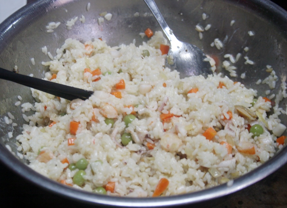 - Đổ hỗn hợp hải sản + rau củ vào cơm đã rang, trộn đều để cơm tơi, cho thêm mayonnaise vào trộn đều.