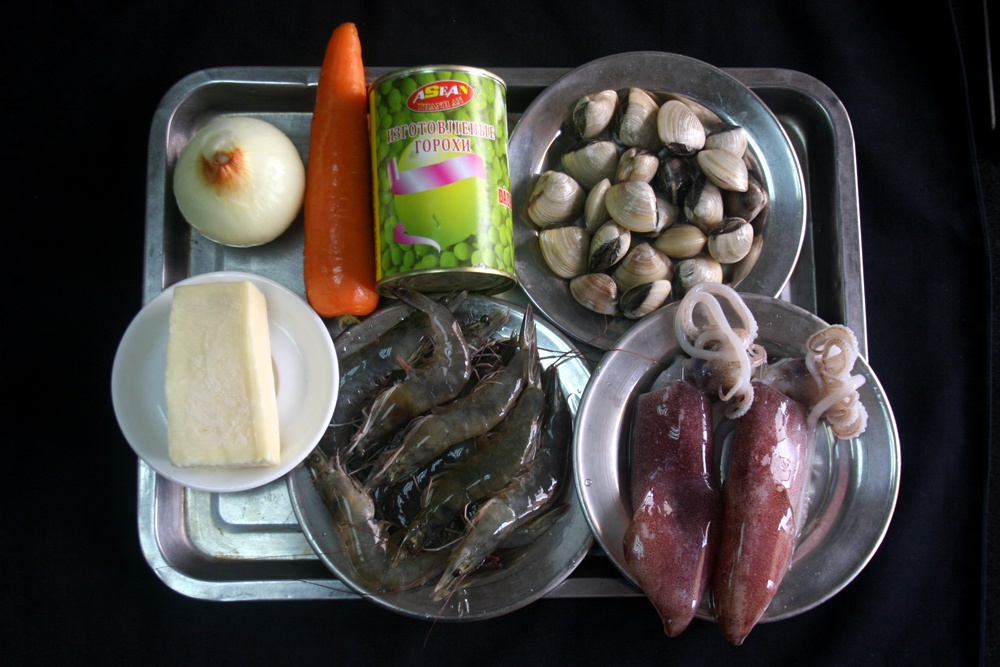- Chảo nóng cho dầu ăn vào, tiếp đến cho hành tây xào thơm (không cần vàng), đổ mực, tôm, ngao vào đảo đều, bỏ thêm chút gia vị. Cho tiếp cà rốt, đậu hạt vào đảo đều, nêm nếm vừa ăn với hạt nêm. Đảo đều 1-2 phút để cơm nóng và hỗn hợp đều nhau.