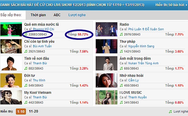 Hình ảnh danh sách các bài hát đề cử cho liveshow Bài hát yêu thích tháng 12 xếp theo thứ tự lượt nghe. |