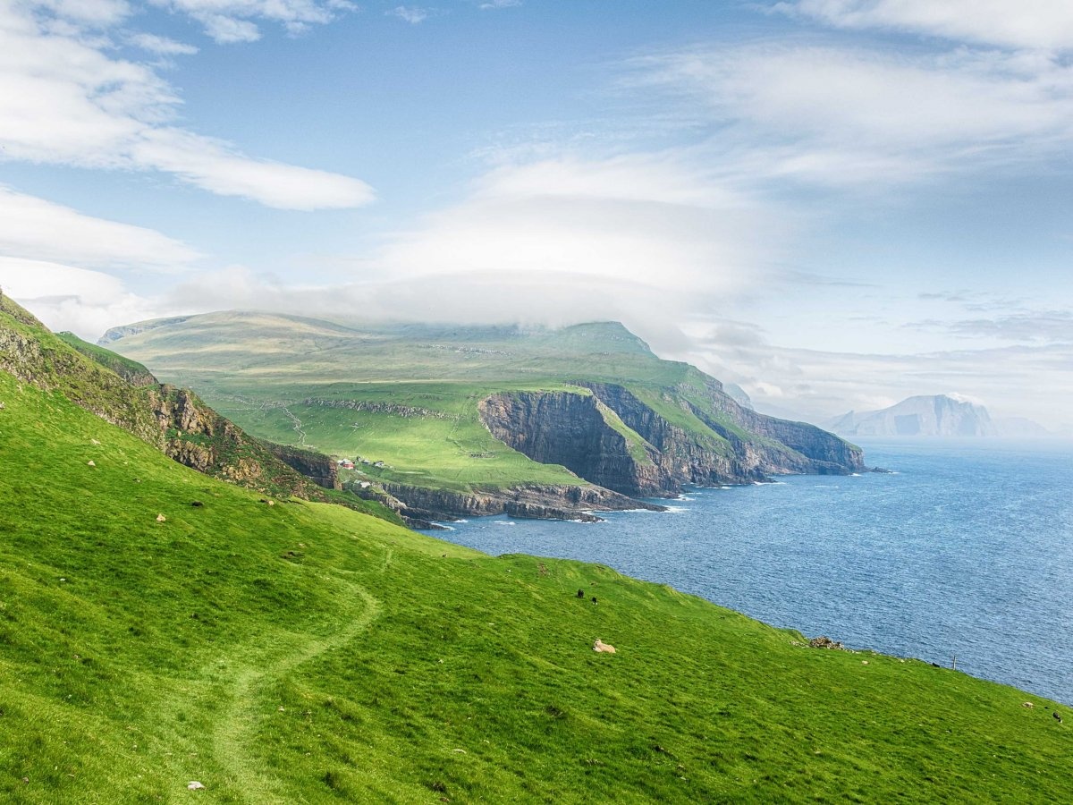Mykines thuộc quần đảo Faroe, nằm giữa Na Uy và Iceland. Những ngôi nhà ở đây có mái cỏ độc đáo, đảo cũng có rất nhiều chim Puffin. |