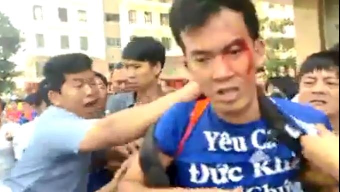 | Nam thanh niên bị đánh chảy máu đầu. Ảnh cắt từ clip. |