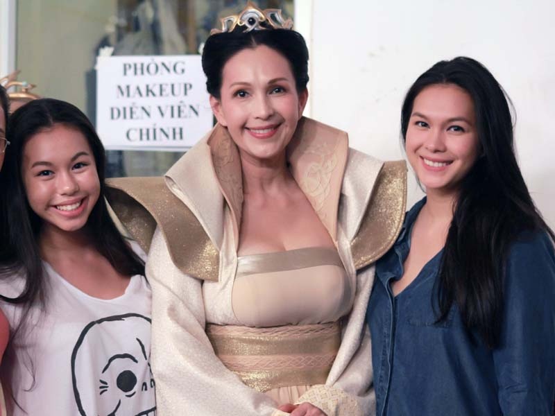 | Biết Diễm My phải quay hình cả ngày, chồng và hai cô con gái đã rủ nhau đến thăm nhưng không báo trước nhằm cổ vũ tinh thần cho người đẹp. Diễm My chia sẻ: “Khi thấy anh ấy cùng Thuỳ My và Quế My xuất hiện tại trường quay, tôi rất bất ngờ và hạnh phúc, bao nhiêu vất vả khi đóng phim không còn nữa. Hai cháu còn khen tạo hình mới của mẹ lạ và sáng tạo". |