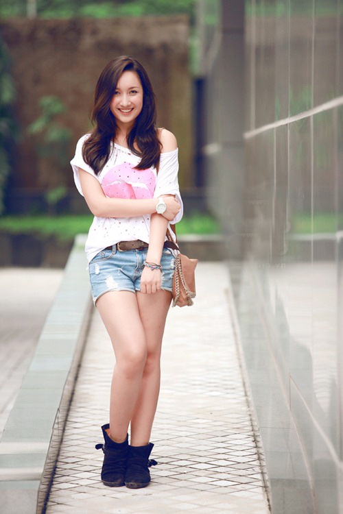 | Khi đi dã ngoại hay xuống phố cùng bạn bè, cô nàng lại biến hóa style trẻ trung, hiện đại với shorts ngắn và áo thun. |
