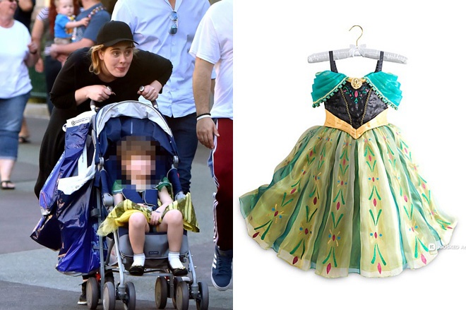 Cậu bé Angelo 3 tuổi được mẹ mặc cho trang phục của công chúa Anna trong phim hoạt hình Frozen (Nữ hoàng băng giá). Trong khi đó, Adele cũng ăn mặc khá giản dị và thoải mái với váy liền màu đen.