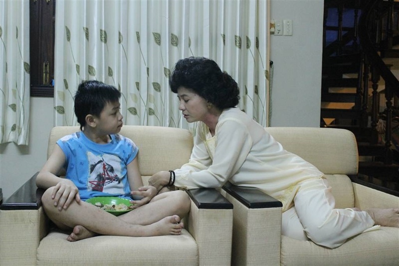 Cu Bom rất ngoan ngoãn và lễ phép khi tranh thủ giờ nghỉ học đến thăm mẹ đang làm việc ở phim trường.