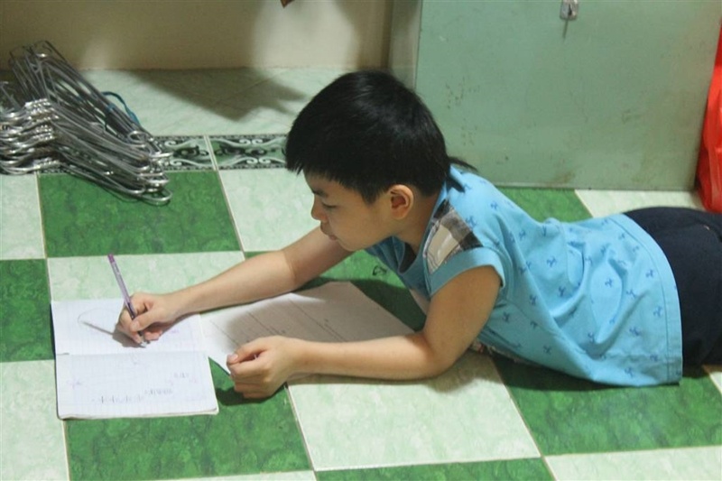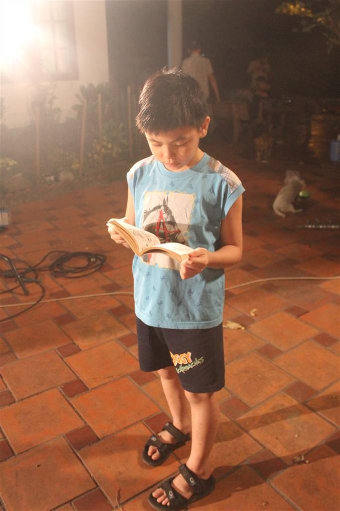 Không vòi vĩnh mẹ, Bom ngoan ngoãn tận dụng đèn máy quay để đọc sách rồi vào phòng trang phục để làm bài tập về nhà.