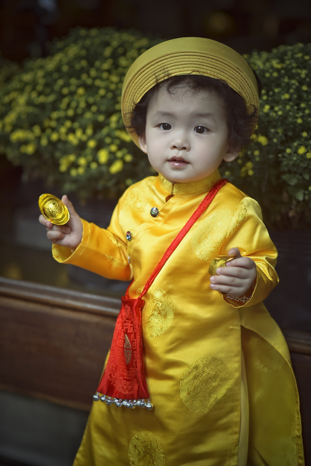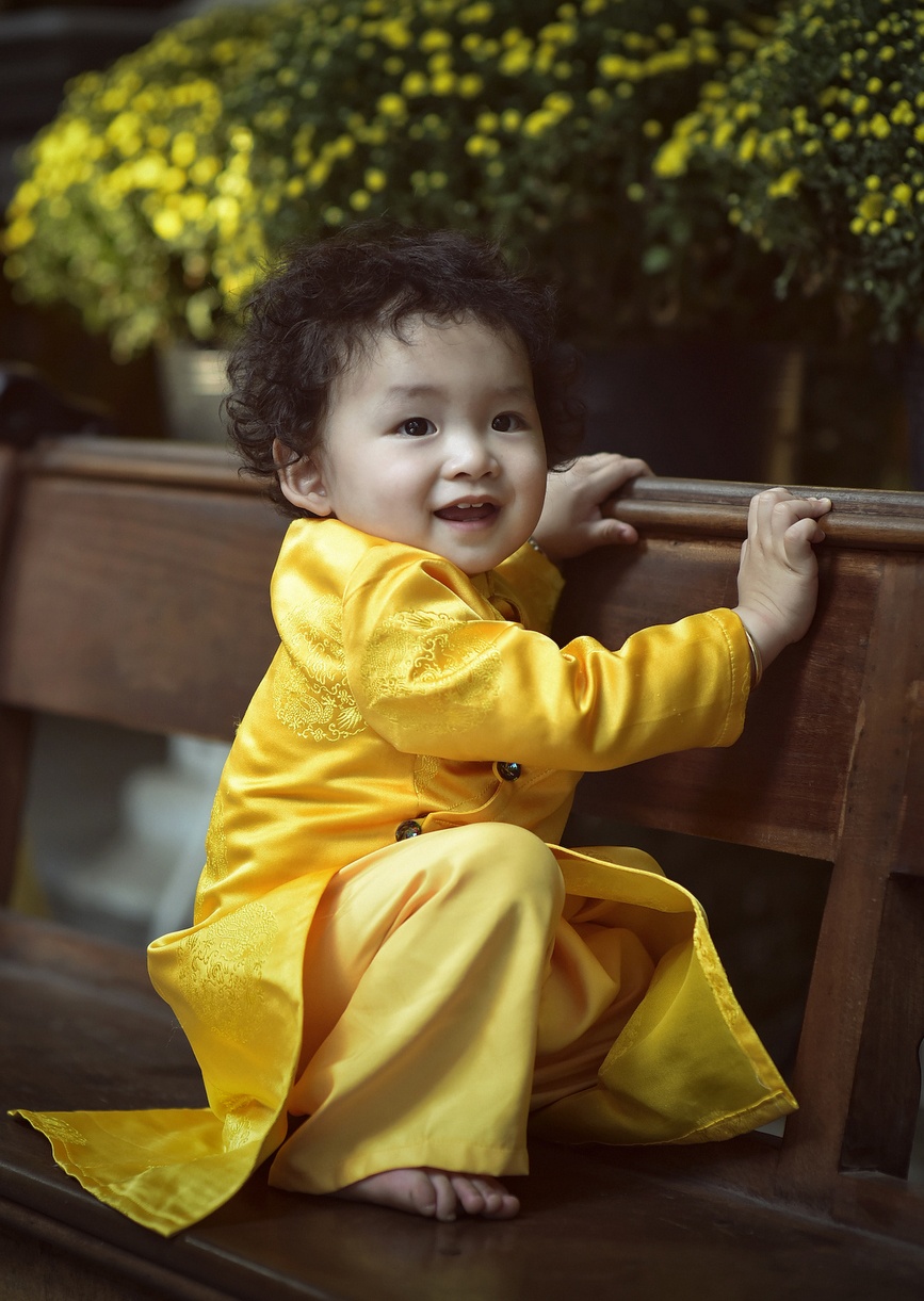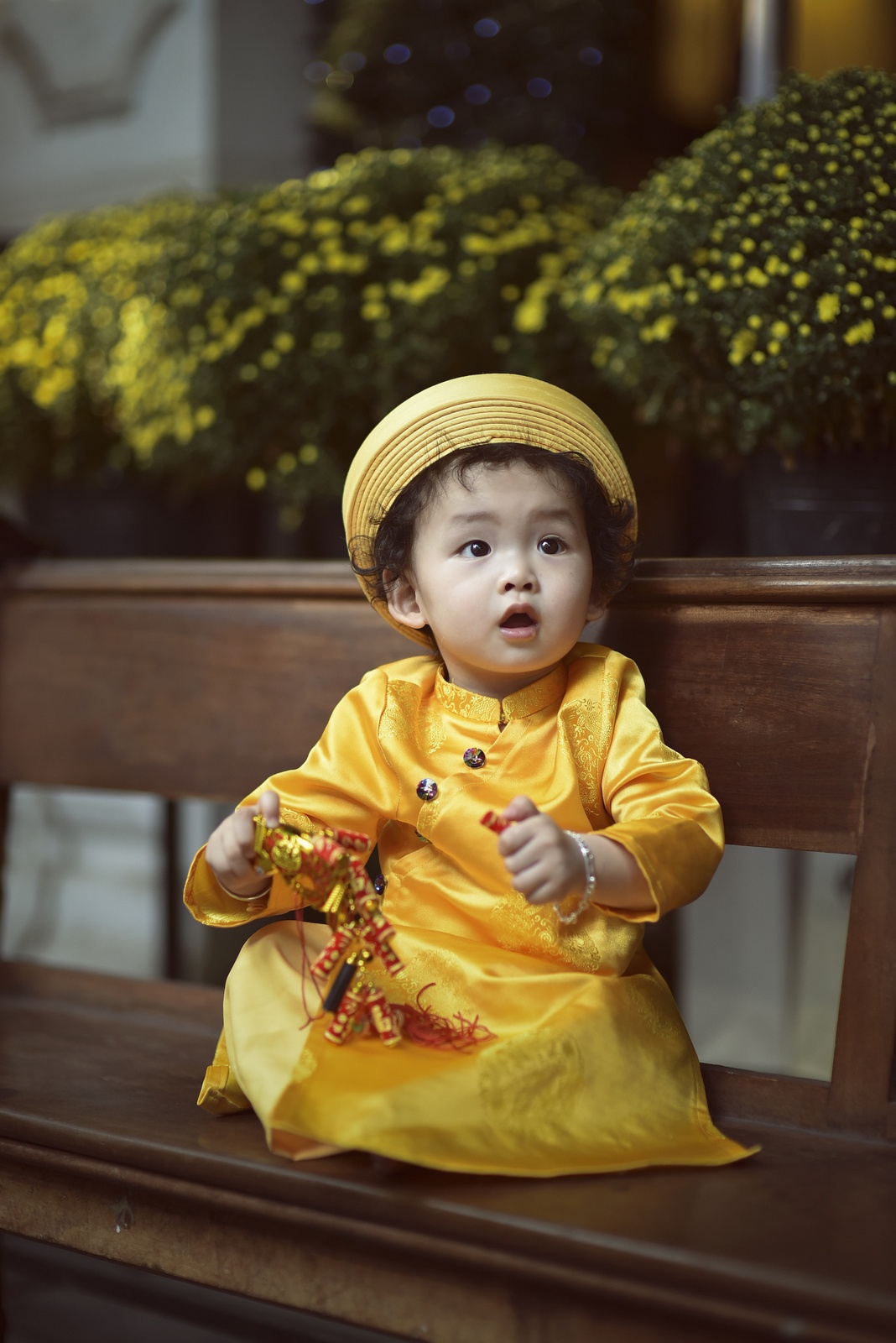 Được chụp ảnh Tết cùng bố mẹ, nhóc tỳ một tuổi diện áo dài màu vàng, cười tít mắt khi một mình tạo dáng.