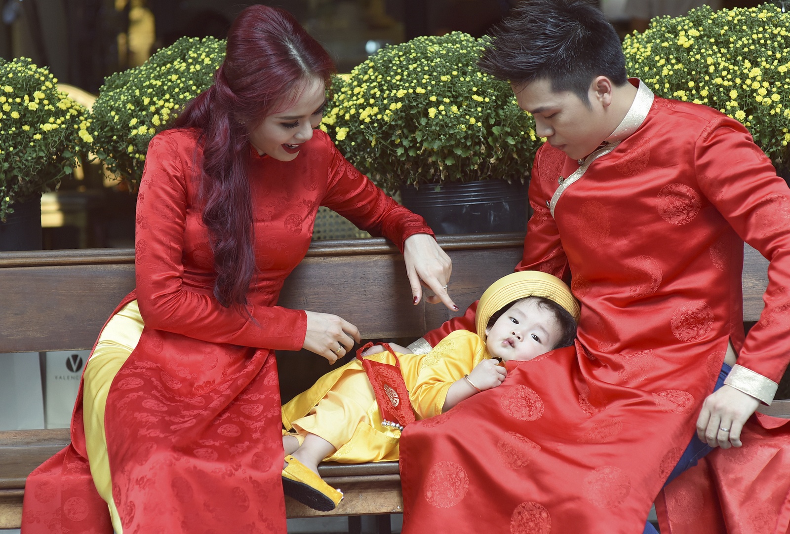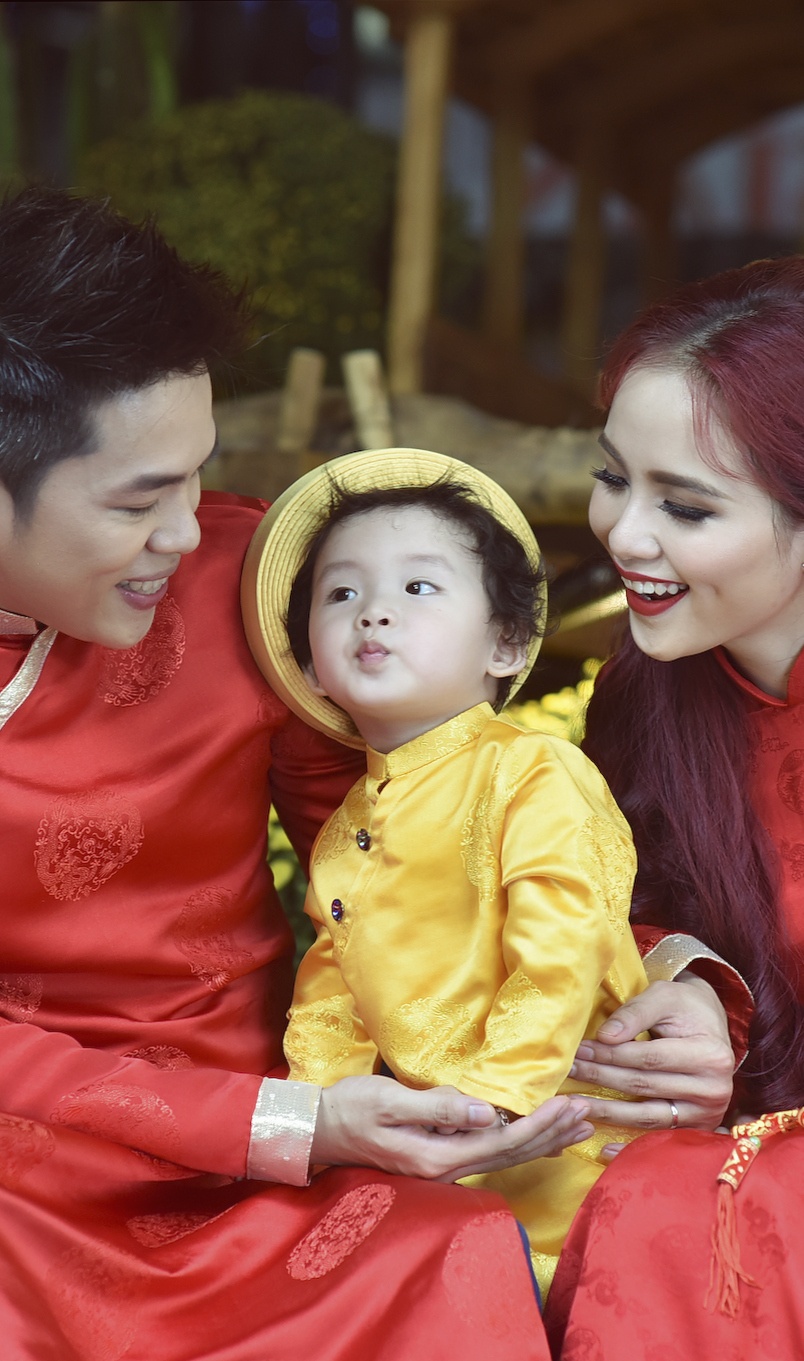 | Ngoài cậu nhóc một tuổi, hoa hậu và ông xã cũng tham gia chụp ảnh. Hai vợ chồng diện áo dài đỏ họa tiết truyền thống. |