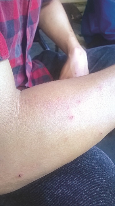 Ông Nguyễn Đóa (76 tuổi, ngụ tại nhà số 114) cũng bị loại côn trùng này tấn công gây nên hàng chục vết đỏ bầm do côn trùng cắn ở tay, chân và bụng, gây ngứa.
