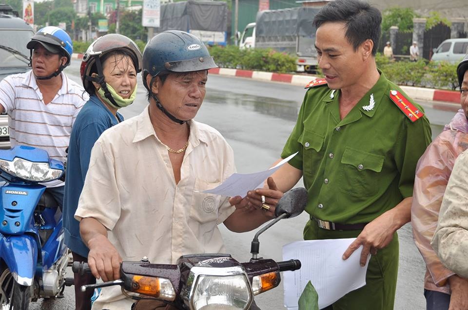 | Công an phát tờ rơi cho người dân. Ảnh: Ngọc An. |