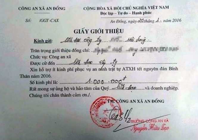 Cụ thể, giấy giới thiệu đến doanh nghiệp xin tiền được ký ngày 20/1. Lý do xin tiền là để Công an xã An Đồng phục vụ công tác giữ an ninh trật tự xã hội dịp tết nguyên đán Bính Thân 2016. Mức kinh phí hỗ trợ được ghi cụ thể là 1 triệu đồng.