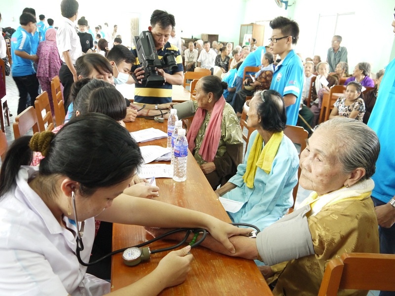 | Đoàn từ thiện khám bệnh cho những người dân tạ xã Hòa Lộc, huyện Tam Bình, tỉnh Vĩnh Long. |