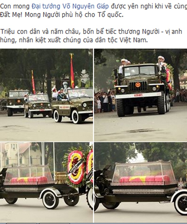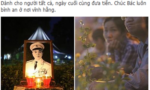 14h20, những dòng tiếc thương vẫn không ngừng được gửi đến fanpage Đại tướng Võ Nguyên Giáp. "Trong giờ phút tiễn đưa Người, thấy hình ảnh của ông nội mắt đẫm lệ vì thương tiếc người "anh cả" của mình về cõi vĩnh hằng, nhìn hàng triệu đồng bào cúi đầu hai bên đường đưa tiễn Đại tướng về nơi an nghỉ cuối cùng mới thấu hiểu sự tin yêu, kính trọng của cả dân tộc với người con vĩ đại đã hi sinh cả cuộc đời vì nước vì dân! Cuộc đời Đại tướng trải qua biết bao thăng trầm thư thách, bao chiến thắng thiệt thòi - ở bất cứ thời điểm nào Đại tướng cũng vẫn sắt son đức độ lo nghĩ cho đất nước cho nhân dân! Người là tấm gương cho cả dân tộc noi theo", thành viên Nguyễn Tuấn Hải, chia sẻ.