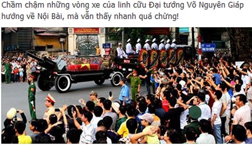 16h, người người tập trung theo dõi tường thuật trực tiếp lễ an táng Đại tướng tại Vũng Chùa (Quảng Trạch, Quảng Bình). Thành viên Lê Minh Trình viết: "Một cuộc đời, từ lúc lọt lòng Mẹ tới lúc về lại với Đất mẹ với triệu triệu người tiễn đưa".
