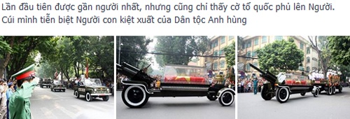 | "Lần đầu tiên được gần Người nhất, nhưng cũng chỉ thấy cờ tổ quốc phủ lên Người. Cúi mình tiễn biệt Người con kiệt xuất của dân tộc anh hùng". |